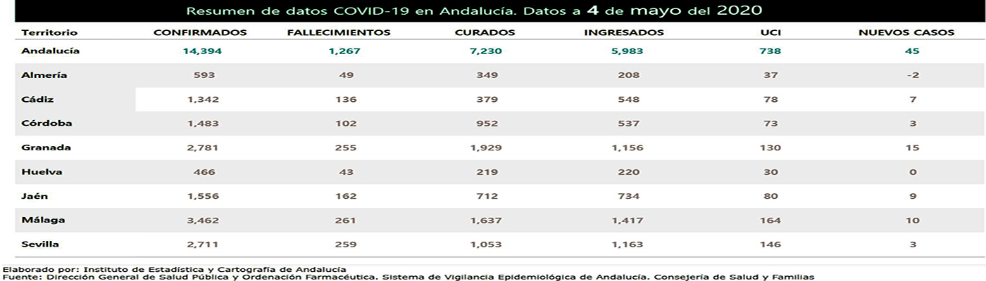 La Consejería Salud y Familias informa del aumento de 45 nuevos casos de Coronavirus en las últimas horas. La Consejería Salud y Familias informa, con fecha 5 de mayo, de que se han confirmado en Andalucía 45 nuevos casos de Coronavirus en las últimas horas, por lo que el número total de afectados en asciende a 14.394 personas en nuestra Comunidad.
