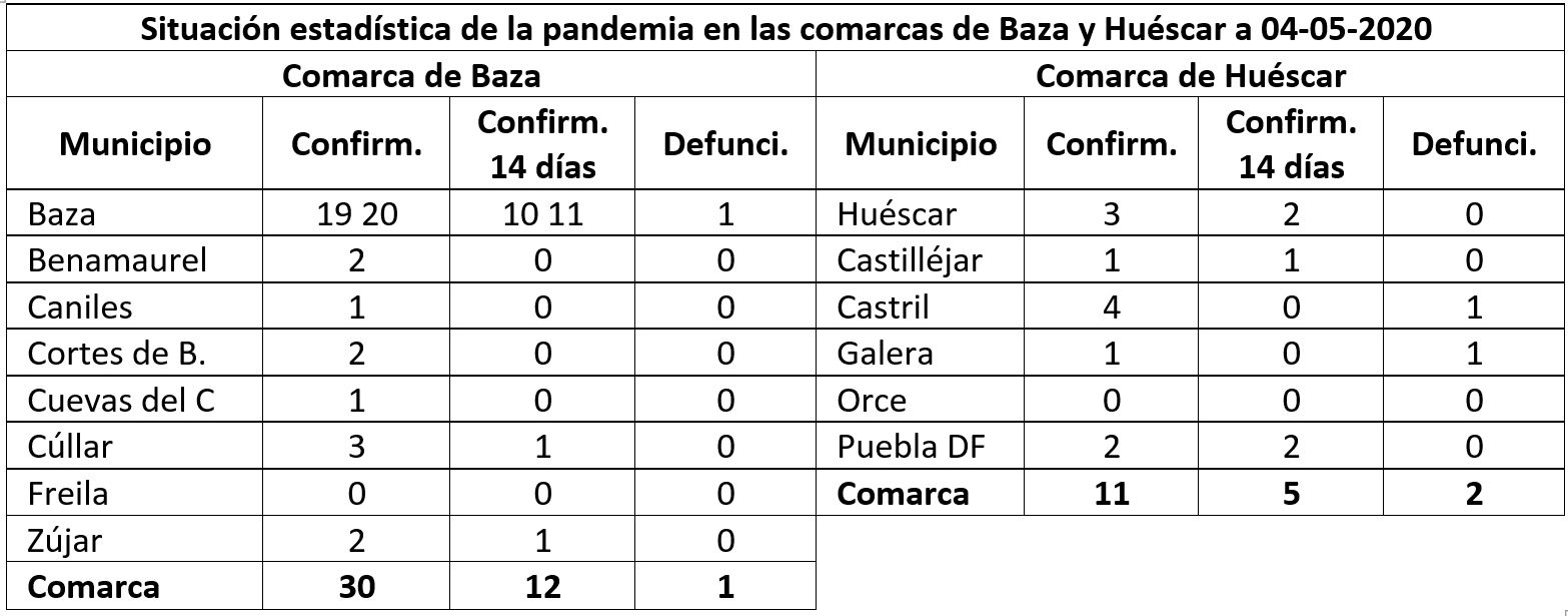 Como ya ocurriera ayer, aparecen sin variación en los datos por municipios de personas contagiadas y fallecidas en las comarcas de Baza y Huéscar a fecha 4 de mayo, que ofrece la Junta de Andalucía. Datos en los que la única variación ha sido el aumento de un confirmado más en Baza, algo que no nos acaba de cuadrar, dado que es una situación que se repite y que no es coincidente con los datos que se ofrecen desde el propio Hospital bastetano.