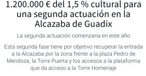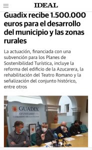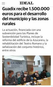 El municipio accitano ha recibido otra subvención de 1.500.000 euros enmarcada en la convocatoria extraordinaria para el desarrollo Planes de Sostenibilidad Turística en Destino que se financiarán íntegramente con los fondos de recuperación Next Generation UE. Entre los proyectos previstos destaca la rehabilitación arquitectónica y funcional de parte del edificio de la azucarera de San Torcuato con el objetivo de convertirlo en un Centro de Interpretación del Geoparque, para lo que se ha destinado 300.000 euros, así como la habilitación para uso turístico del Teatro Romano y la señalización turística urbana del conjunto histórico de Guadix.