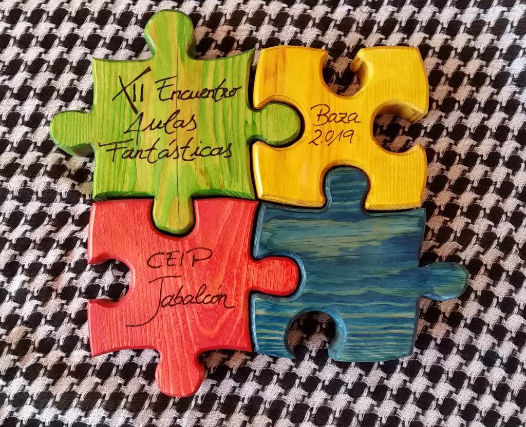 El encuentro ese iniciaba a las 9 de la mañana con el recibimiento del alumnado y con el paso por el photocall preparado al efecto. Tras ello, ya en el salón de actos se les dio la bienvenida a todos los participantes con un discurso inicial por parte de la organización, y unas palabras de bienvenida del Equipo directivo. A continuación, los alumnos y alumnas de 6º, fueron presentando a los diferentes protagonistas de las “Aulas Fantásticas”, a la vez que se le entregaba un puzle de madera, realizado de forma artesanal por un profesor del CEIP Jabalcón con el logo del centro. Seguidamente disfrutaron de un divertido cuentacuentos “interactivo” donde participó todo el alumnado. El acto continuaba con una deliciosa y suculenta merienda para reponer fuerzas antes de iniciar los talleres (de chapas, collares…) que se habían preparado para finalizar el evento. Se finalizó la jornada despidiendo a los asistentes y pasando el testigo a los encargados de organizar el próximo encuentro, el CEIP “Princesa Sofía” de Huéscar.