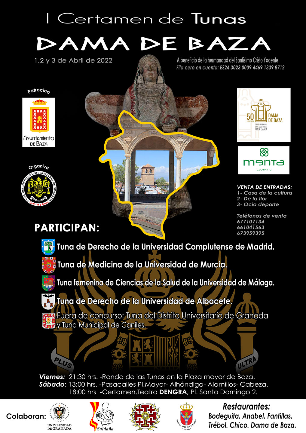 Por otro lado, para que este evento tunantesco haya sido posible llevarlo a cabo en la Ciudad de la Dama, ha resultado fundamental el patrocinio del Excmo. Ayuntamiento de Baza, a través de las concejalías de Cultura y Turismo del mismo, así como el hecho de enmarcarlo dentro de la programación anual que, con motivo de la conmemoración del quincuagésimo aniversario del descubrimiento de la Dama de Baza (1971-2021), icono de la ciudad y obra cumbre del arte ibérico peninsular, se está desarrollando en Baza. Así como han colaborado, en cuanto se refiere a su organización, la Tuna Municipal de Caniles y Hermandad Parroquial y Sacramental del Santísimo Cristo Yacente. Tampoco debemos olvidar a las entidades privadas que colaboran económicamente con el mismo: la boutique Menta de Baza, la sastrería Saldaña de Granada; y los restaurantes bastetanos: la Bodeguilla, el hotel Anabel, Fantillas, Trébol, Chico y Dama de Baza.