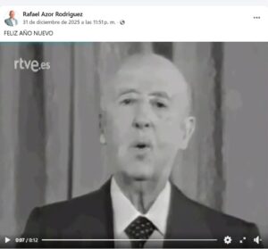 La entrada del año 2026 nos ha dejado una muestra más de lo poco que le gusta la democracia al concejal del equipo de gobierno, concejal no adscrito ex concejal de VOX Rafael Azor. Una vez más, nos felicita el año con un vídeo del dictador Franco, el mismo que se levantó contra la democracia en nuestro país allá por el 36 y mantuvo durante 40 años a España fuera del mundo, sin libertad, bajo su tiranía y con la represión violenta como modus operandi…