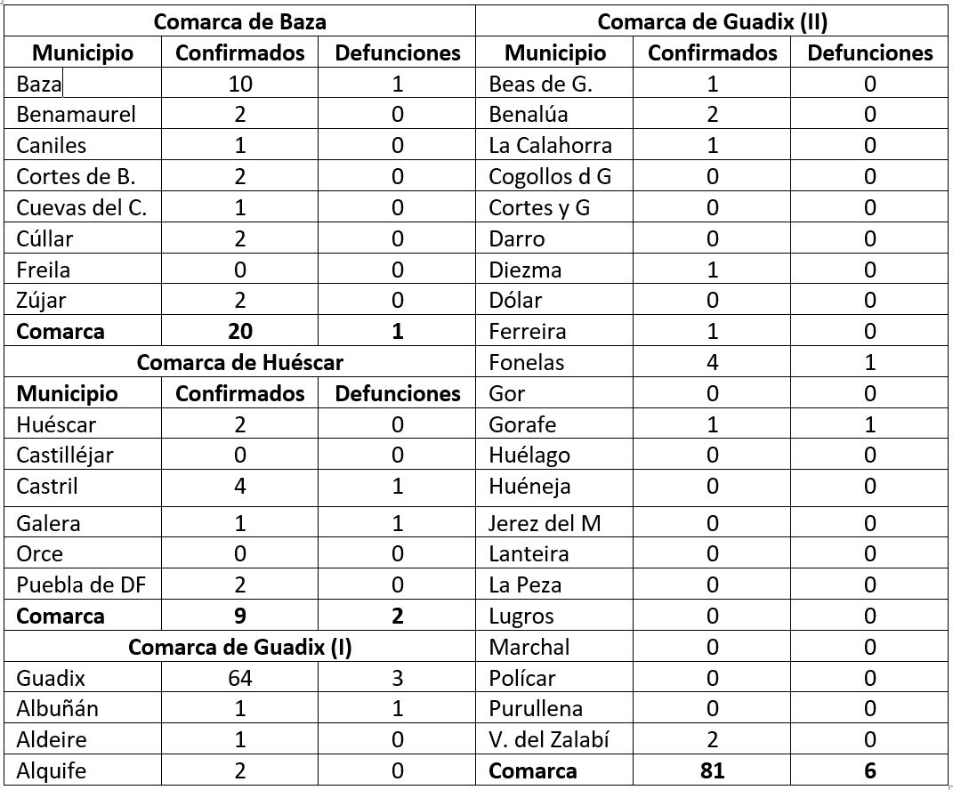 Así las cosas, el dato que nos queda pendiente de confirmar ahora es de la cifra de fallecidos, dado que la Junta de Andalucía sigue insistiendo en que han sido 10, mientras que en esta última información, en las comarcas de Guadix, Baza y Huéscar sólo aparecen 9. Hemos indagado en los municipios de Pozo Alcón (0 y 0) e Hinojares (0 y 0), por lo que sólo queda la opción de que haya podido acaecer el décimo fallecimiento en alguno de los municipios almerienses que tienen acceso al Área Sanitaria del Nordeste de Granada, algo que, de momento, seguimos ignorando y sobre lo que tampoco se nos ha facilitado información alguna.