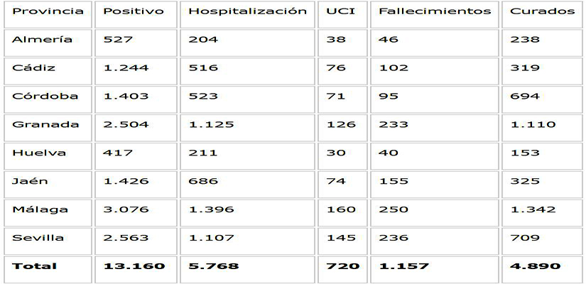 Por provincias: en Almería (33 hospitalizaciones de los que 10 en UCI), Cádiz (110 hospitalizaciones de los que 23 en UCI), Córdoba (55 hospitalizaciones de los que 18 en UCI), Granada (196 hospitalizaciones de los que 36 en UCI), Huelva (26 hospitalizaciones de los que 9 en UCI), Jaén (86 hospitalizaciones de los que 20 en UCI), Málaga (145 hospitalizaciones de los que 33 en UCI) y Sevilla (159 hospitalizaciones de los que 38 en UCI).