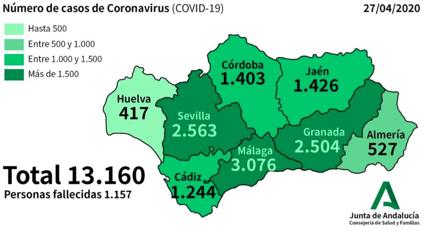 La Consejería Salud y Familias informa que se han confirmado en Andalucía 137 nuevos casos de Coronavirus en las últimas horas. La Consejería Salud y Familias informa que se han confirmado en Andalucía 137 nuevos casos de Coronavirus en las últimas horas. Así, el número total de afectados en Andalucía asciende a 13.160.