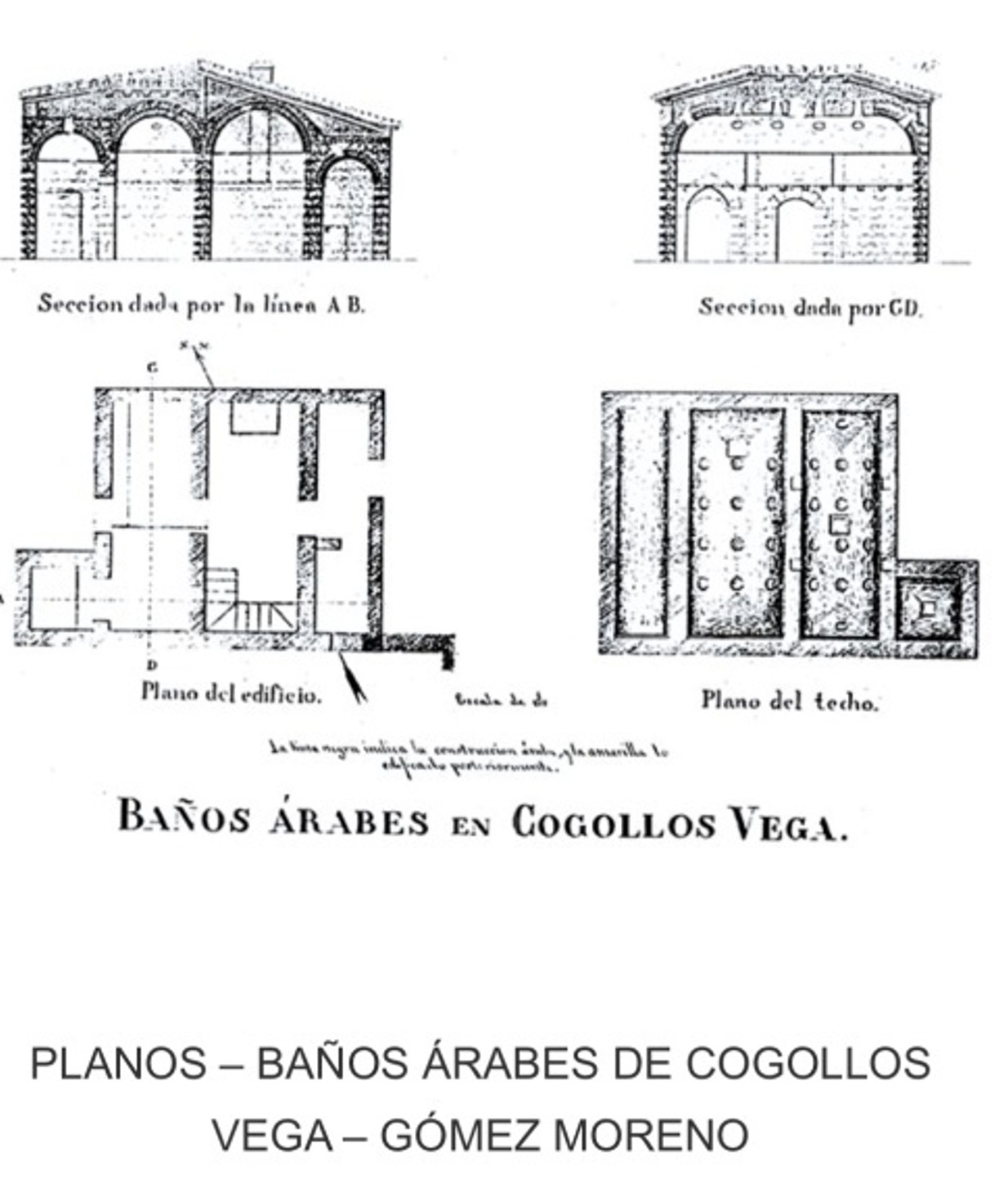 En distintas vitrinas (junto a planos enmarcados, pequeños paneles explicativos…) se exhibirían las planimetrías de los baños árabes del Geoparque así como los estudios de finales del siglo XIX realizados por Gómez-Moreno -padre e hijo-. Para ello se solicitarían copias de los mismos al Instituto Gómez-Moreno, de la Fundación Rodríguez-Acosta (Granada). De aquellos baños que no visitaron dicha saga de historiadores se presentarían planos actuales, muchos de los cuales los pueden encontrar en la bibliografía que presentamos.