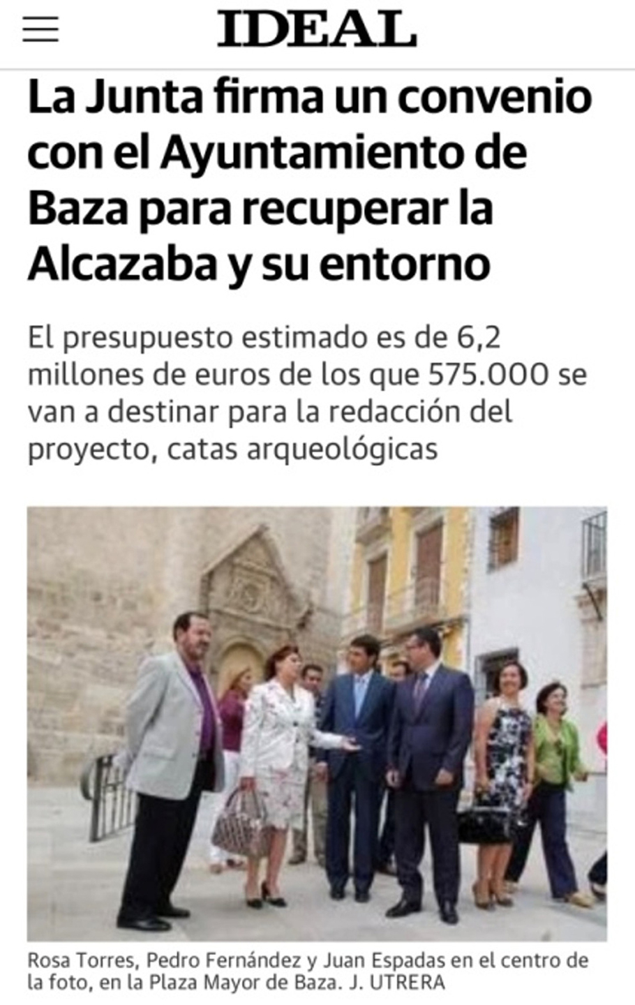 1. El 21 de noviembre de 2006 Antonio Martínez, alcalde de Baza y Pedro Fernández Peñalver, delegado de Obras Públicas en ese momento, aseguraban que se iban a recuperar todos los elementos del antiguo recinto militar que aún perviven. Han pasado 16 años, no se ha hecho nada y la Alcazaba se ha convertido en el solar municipal para construir edificios públicos. El anterior Defensor del Pueblo Andaluz, Pedro Chamizo, señaló en 2009 la “falta de actuación” de las administraciones implicadas en el cuidado de los monumentos bastetanos –Consejería de Cultura y Ayuntamiento- para evitar situaciones de derrumbe o demolición en edificios como la Alcazaba.