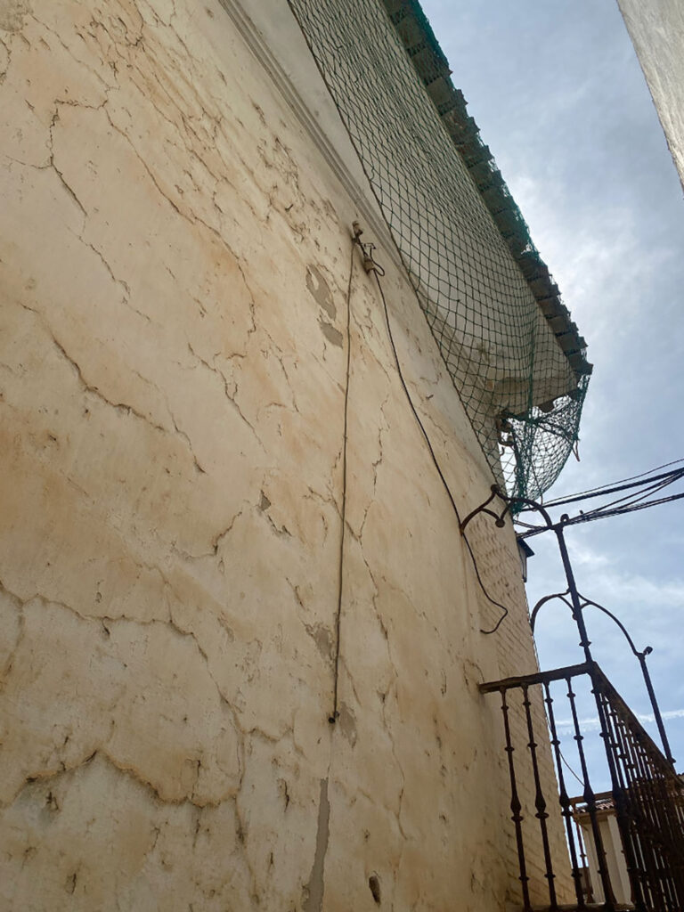 Los aleros de cuarto de bocel de la fachada principal, y lateral, están agrietándose, deteriorándose constantemente, con desprendimientos hacia la vía pública. Hace más de un año se colocó una red pues están cayendo hacia la calle, tal y como han visto en las imágenes presentes en este artículo