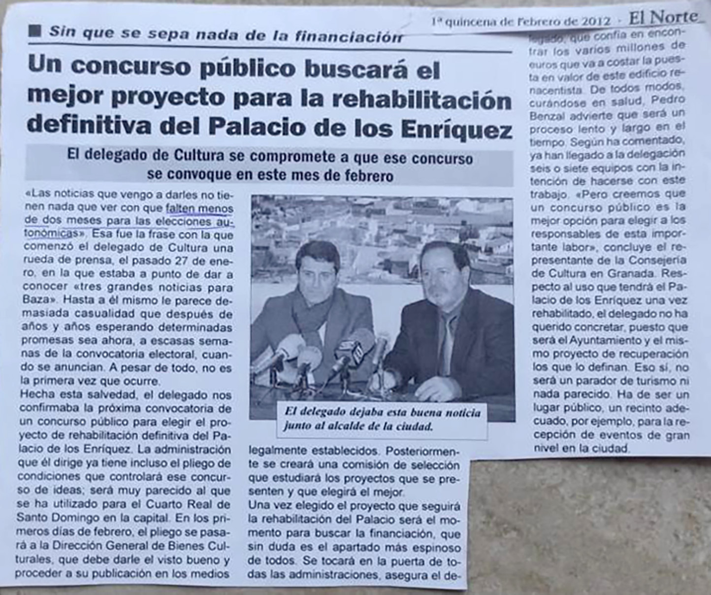 Es vergonzoso ver cómo están llegando millones de euros para el patrimonio español por toda España y nada para Baza. PSOE y PP han anunciado y/o reivindicado todas las legislaturas la restauración del palacio. Jamás han movido un solo dedo.
