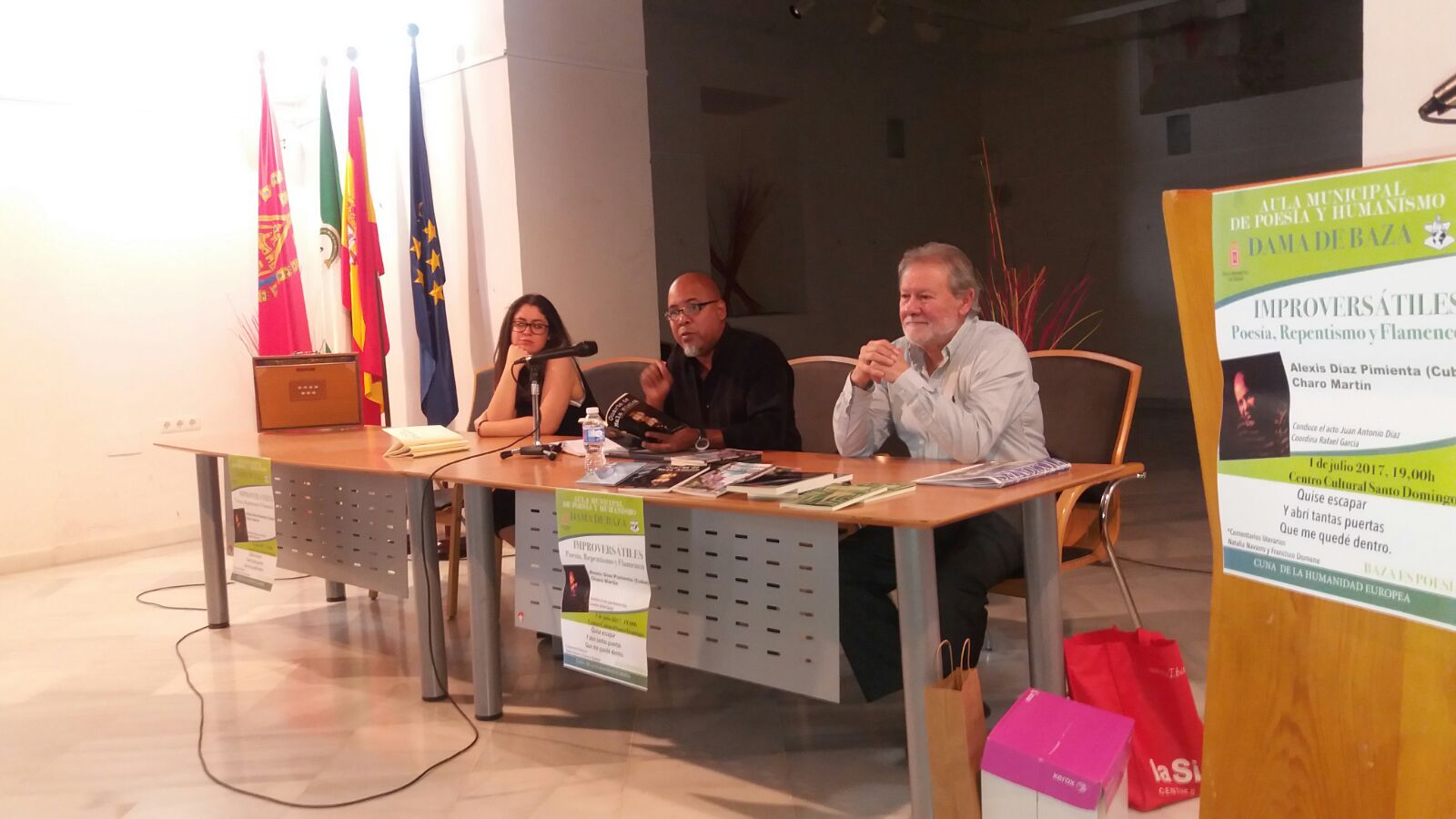 En la inauguración de la época estival del año, pudimos contar en el Aula con uno “de los platos fuertes” del mismo, “Improversátiles”, un espectáculo que combina Poesía, Repentismo y Flamenco, del repentista Alexis Díaz-Pimienta (Cuba) y Charo Martín. Sin lugar a dudas, una espléndida noche de verano, donde el sueño poético pudo ser posible, gracias a los versos que nos llegaron de La Habana, aquella onírica ciudad que fue nuestra joya más preciada. En este acto, Alexis Díaz-Pimienta recitó poemas de varios de sus libros: “Traficantes de Oxigeno”, “Cuarto de Mala Música”, “Haikus del Trópico”, “Diario Erótico de Robinsón Crusoe”…, y los comentarios literarios que corrieron a cargo del poeta Francisco Domene.