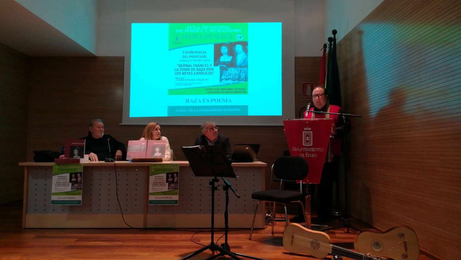 Y, para finalizar el año, concretamente el día de San Andrés, no pudo haber un mejor broche para la clausura del Aula Municipal de Poesía y Humanismo «Dama de Baza», que contar con la erudición, sapiencia, pedagogía y didáctica del profesor Francisco Tristán García. Disertó, este docto catedrático, de una amena e interesante manera, sobre: «Bernal Francés y la Toma de Baza por los Reyes Católicos» en el 528º aniversario de la Incorporación de Baza a la Corona de Castilla. Sublime la actuación de Javier Molina Argente que, con su vihuela y guitarra barroca, nos transportó, mediante un «sensorial viaje en el tiempo», a la época de la conquista de Baza por los Reyes Católicos.