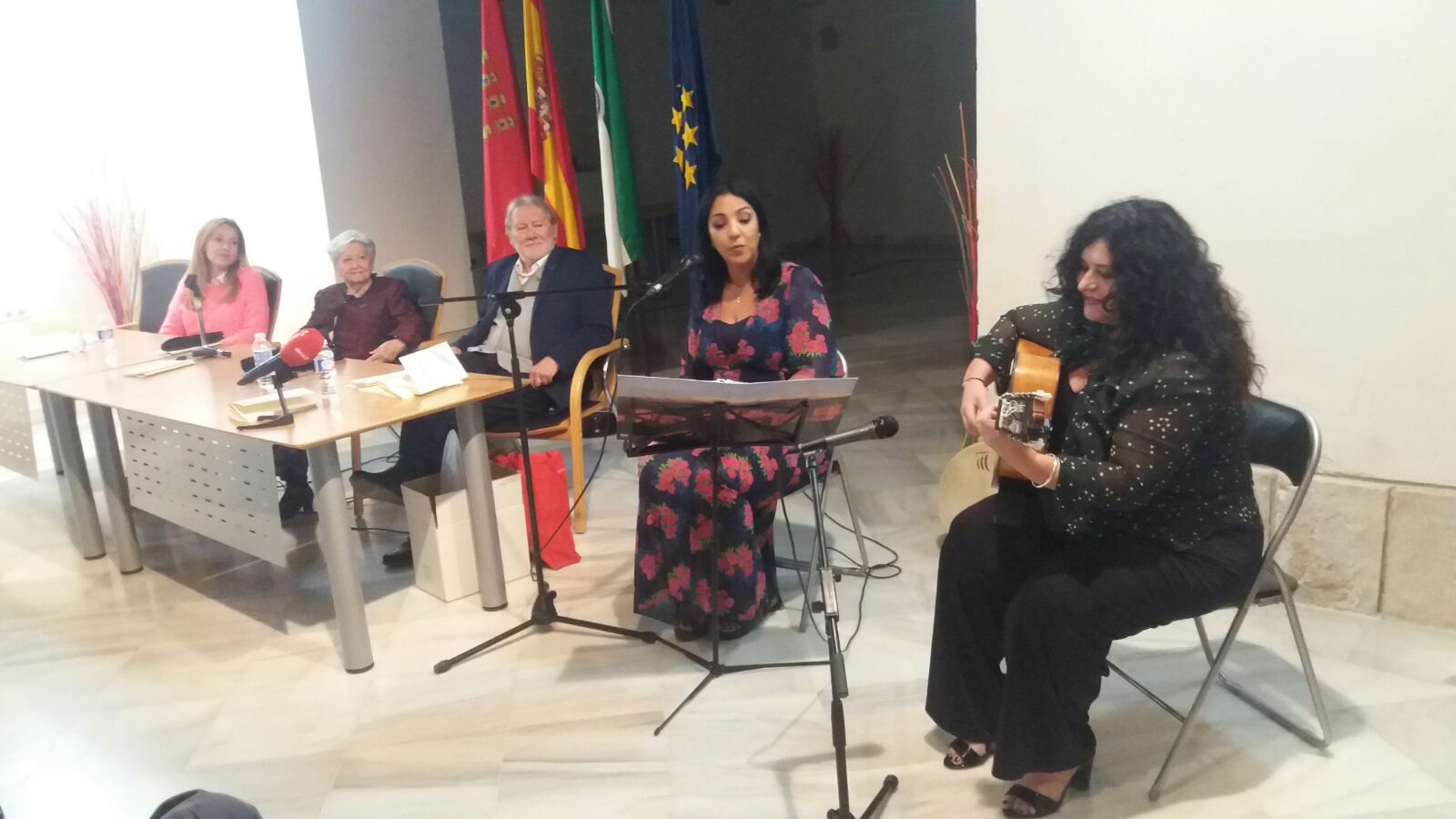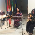 Una semana después, tuvimos la inconmensurable suerte de contar con la poetisa madrileña, Isabel Rodríguez. En esta ocasión, con un doble motivo de alegría y satisfacción, el primero fue la presentación de su último poemario, que ha editado el Aula, “Exilios”, y, en segundo lugar, le rendimos un homenaje a su trayectoria literaria. Dicho poemario estuvo prologado por el poeta Francisco Domene, quien realizó un profundo y erudito –como suele ser habitual en él− comentario sobre el mismo. En cuanto al homenaje, fue organizado por sus familiares y amigos, que quisieron darse cita en la ciudad de la Dama, para honrar a esta poetisa imprescindible y necesaria en nuestro panorama literario y poético actual. El broche musical que se propuso para amenizar el acto, llevaba nombre bastetano y nombre femenino: “Mujeres Mediterráneas”, compañía flamenca compuesta, en parte, por la bastetana Pilar Alonso (guitarra flamenca) y Habiba Ouakhchachi (voz árabe y bendir). Y Pedro Romero al arpa, que interpretaron una espectacular versión del Concierto de Aranjuez del maestro Joaquín Rodrigo, en honor al lugar de residencia de nuestra homenajeada.
