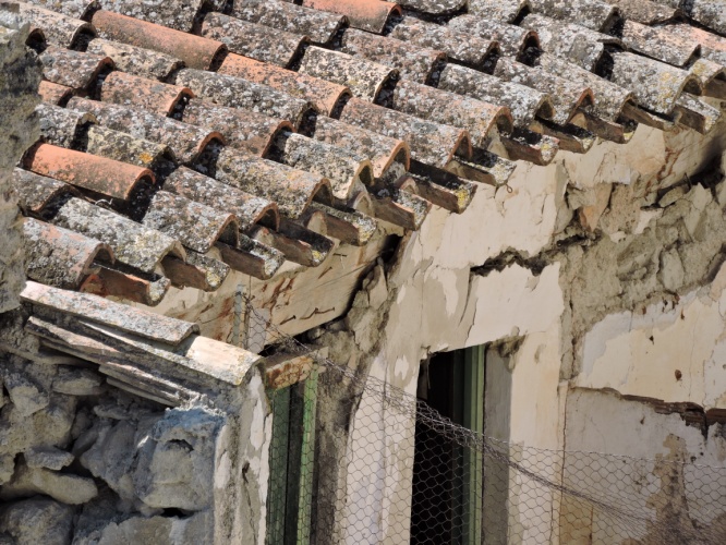 Cubierta a punto de caer. Otoño de 2016. Muros en los que se apoyaban la cubierta. Unos han caído en los últimos años y lo poco que queda caerá pronto.