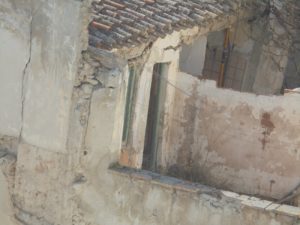 La cubierta está a punto de caer. En los últimos años han estado desplomándose gran parte de los muros hacia el patio interior. Hace varios cayeron los situados a su derecha y a su izquierda. Hace más de un año cayó todo el suelo que divide las dos plantas de este módulo.