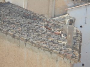 La cubierta de poniente, la asomada a la plaza de Santo Domingo, tiene numerosos recalos. Los muros y aleros que las sustentan se están desmoronando y las claves de la galería aragonesas están agrietándose. Dentro de poco pueden comenzar a caer. Que conste que muchos bastetanos se sientan en mesas y sillas colocadas junto a la fachada cuando llega el invierno. Si no se interviene pronto puede ocurrir una desgracia. Vean en primer lugar las claves de los arcos, agrietándose por el mal estado del edificio. Las grietas están anunciando los futuros desplomes y hundimientos.