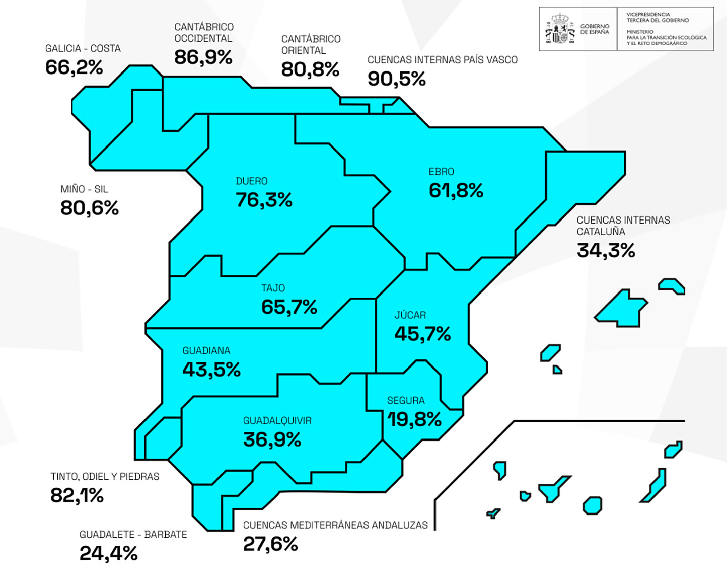 En cuanto a la situación de las diferentes cuencas hidrográficas, las que se encuentran con un almacenamiento superior al 60% de su capacidad son: Cantábrico Occidental al 91,8%, Cuencas internas del País Vasco al 90,5%, Duero al 89,6%, Miño-Sil al 86,4%, Tinto, Odiel y Piedras al 85,2%, Cantábrico Oriental se encuentra al 83,6%, Tajo al 75,7%, Galicia Costa al 75,3% y Ebro al 74,5%.