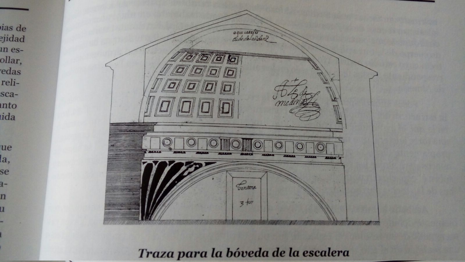 La caja de la escalera, ubicada en el hueco de la torre, está hoy en día dividida en tres plantas… En el tercer piso encontramos la magnífica cúpula, trazada por el maestro Alonso de Medina en 1624. Lo pueden apreciar en el dibujo siguiente…