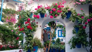 Que Córdoba fue romana, lo vemos con sólo cruzar el puente Viejo sobre el Guadalquivir, con sus 16 arcos, de los 17 que tenía en su origen; que fue judía, nos lo dice el barrio de la Judería, con su típico laberinto de callejas; y que musulmana, lo atestigua su Mezquita, protagonista de la que fuera capital del califato omeya, y que resume el estilo hispanomusulmán en tiempos de su mayor apogeo. De sus bellas mujeres, contemplamos algunas en los cuadros de Romero de Torres, quien, como dice la copla popular, pintó a la mujer morena; y de la convivencia de culturas tan diversas como árabe, judía, cristiana y gitana, tenemos el flamenco, un arte andaluz por excelencia, aquí muy arraigado. En tierras cordobesas hace un intenso calor durante muchos meses, lo que propicia sus patios: ya en tiempos romanos y después adoptado por los musulmanes, lograban que la vida doméstica girara en torno a ellos; con una fuente en el centro, y con frecuencia un pozo para recoger el agua de lluvia, siempre bienvenida en climas tan secos y calurosos. El llenar los patios de flores es, pues, una costumbre de siglos, aunque es desde 1921 que el ayuntamiento de Córdoba organiza en la primera quincena de mayo un concurso conocido como Fiesta de los Patios de Córdoba, declarado por la UNESCO hace casi una década como Patrimonio Inmaterial de la Humanidad.