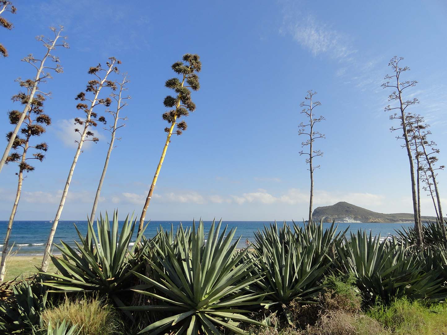 Playas, calas, dunas, arenas volcánicas, acantilados con miradores como el de La Amatista, cadenas montañosas, arrecifes como el de Las Sirenas, pitas, palmito, palmeras, higueras, chumberas, olivos, almendros, salinas y lagunas con sus aguas para refugio de flamencos y demás aves acuáticas, un fondo marino con posidonia y tantos y tan variados peces y fauna submarina que con sólo bucear un poco te deslumbrará. Y junto a las maravillas de la naturaleza, en indivisible fusión, las construcciones humanas: la Iglesia de las Salinas, molinos como el de Campillo de los Genoveses, el Faro, atalayas, aljibes, castillos como los de Los Escullos o el de San Ramón, los restos de las minas de oro de Rodalquilar…, o el Cortijo del Fraile, que no sólo fue testigo del crimen que inspiró a Lorca Bodas de Sangre, sino que ha sido el escenario de múltiples películas como la Trilogía del Dólar: Por un puñado de dólares, El bueno, el feo y el malo, y La muerte tenía un precio, todas con Clint Eastwood como protagonista; hoy está tan abandonado que parece una metáfora de aquellos tiempos gloriosos del rodaje de míticas películas en Almería. Hay tanto por conocer en este privilegiado enclave que puedes ir a lugares con todo el ambiente para disfrutar del verano: como San José, Agua Amarga o San Miguel; o elegir otros más tranquilos, aunque ahora eso ya es casi una utopía, tales como La Isleta del Moro o Las Negras. También puedes acercarte a Níjar, a lo largo de cuyo término municipal se extiende la inmensa mayoría del Parque, para encontrarte con un atractivo comercio en el que destaca la artesanía relacionada con la alfarería y los telares. Al final, respecto a este destino, tan amplio y diverso, lo mejor es dar unas pinceladas y que cada cual se adentre y busque aquellos sitios y paisajes que se conviertan en sus preferidos, porque, superando los 70 km. de costa, tendrán dónde elegir entre sus más de 36 playas, algunas vírgenes, otras con bandera azul y todos los servicios que ello implica. Personalmente me quedo con sus diferentes paisajes verdes con el mar de un azul profundo al fondo; sus montañas volcánicas de color gris, jalonadas a veces por bancales o terrazas con fines agrícolas o para frenar la erosión; el rumor de los pájaros entre las flores de colores y una flora tan característica; y el silencio al caer la noche, cuando el cielo se cubre de estrellas y una siente que no hay un paraje mejor para perderse y olvidar todo lo que resta paz a nuestras vidas.