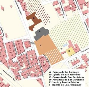 El palacio de los Enríquez, y gran parte del convento de San Jerónimo, son de propiedad municipal. Nuestra propuesta se podría extender al resto de los espacios que lo configuran este magnífico conjunto monumental, tal y como hemos expuesto en otras ocasiones. Vean el anterior croquis.