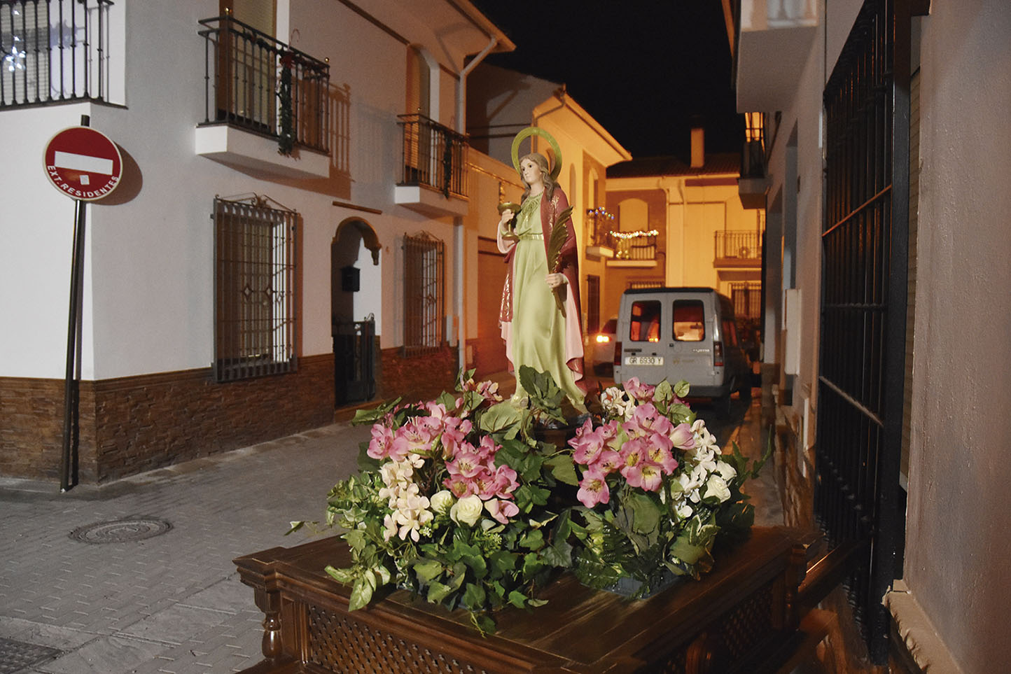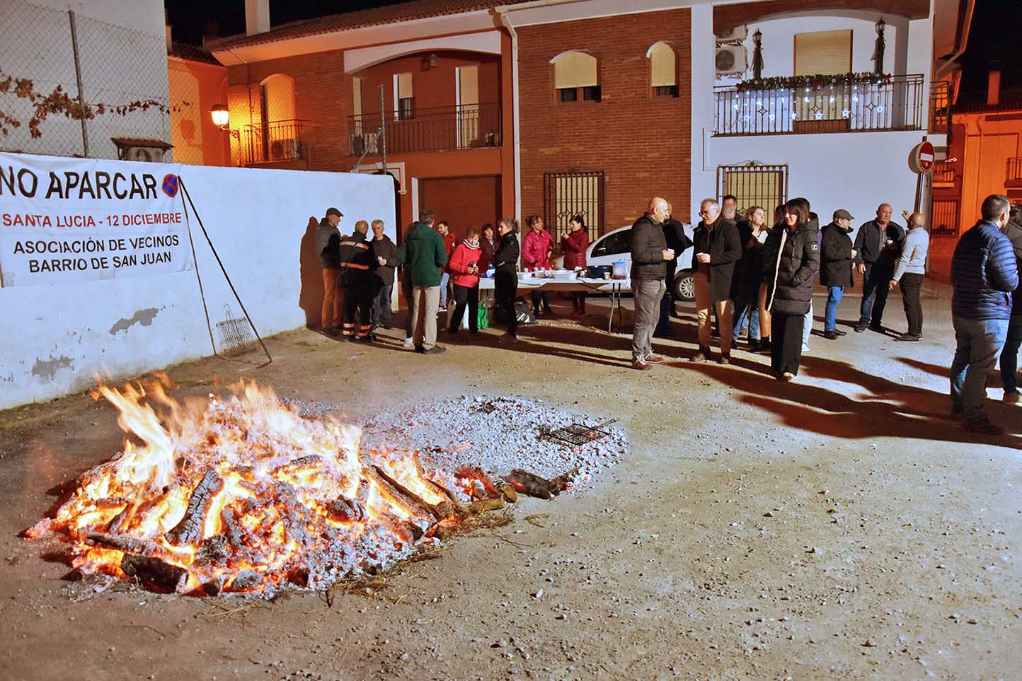 Uno de los momentos más simbólicos volvió a vivirse en el barrio de San Juan, donde no faltó la imagen de Santa Lucía, portada por los vecinos de este popular barrio bastetano y que fue trasladada en procesión desde la iglesia de San Juan hasta el solar en el que se congregó el vecindario en torno al fuego. Una escena cargada de tradición que refuerza el carácter religioso y popular de una celebración transmitida de generación en generación.
