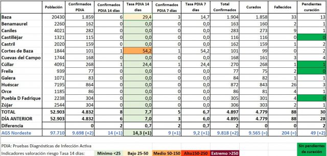 Añadir también que, un día más, la comarca de Huéscar seguía manteniendo sin novedades a todos sus municipios, todos ellos en tasa 0 a 14 días.