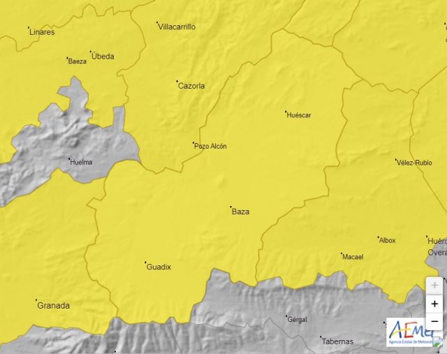 Un riesgo que dejará notar sus efectos, sobre todo, entre las 14,00 y las 21,00 horas y que afectará no solo a Baza sino a las localidades de todas las comarcas que están limitando con las de Baza, Guadix y Huéscar, en las provincias de Almería Murcia y Jaén.