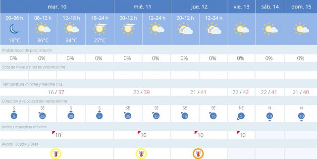 Tras el “descanso” de días atrás, Baza volverá a estar hoy en alerta amarilla por altas temperaturas. Tras unos días de temperaturas más suaves y noches de clima ideal para dormir sin calor, vuelven a subir las temperaturas en Baza, hasta el punto de que la Agencia Estatal de Meteorología ha decretado una nueva alerta de nivel amarillo por riesgo de “temperaturas máximas” que podrían superar los 38ºC.