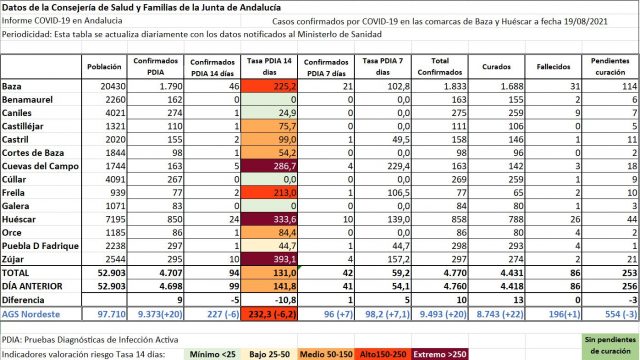 En cuanto a la última jornada, los datos de la misma fuente hablan de 14 nuevos positivos, con fecha del viernes 6, de los que se validaron 6 en Baza, 2 en Cúllar 2 en Huéscar y uno en cada municipio de Castilléjar, Cuevas del Campo, Freila y Zújar, con diferentes resultados en los incrementos de las tasas de incidencia, algo que siempre perjudica más a las localidades de menor población, como ocurre con Freila en donde crece más de 100 puntos o Castilléjar, donde supera los 75.