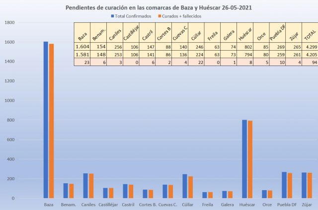 En cuanto a los datos ofrecidos desde la Consejería de Salud de la Junta de Andalucía, hay que añadir otros 10 pacientes curados a los 4.150 que ya se contaban el día anterior, en las comarcas de Baza y Huéscar, donde lo más destacado ha sido el repunte producido en la localidad de La Puebla de don Fadrique que disparaba su tasa de incidencia hasta los 714,9 casos por 100.000 habitantes, mientras que Cúllar, Orce y Huéscar se sumaban a las localidades con tasa cero, si bien la tasa global de las dos comarcas se mantiene en un valor similar al del día anterior, como consecuencia de la fuerte subida producida en la localidad poblata que dispara su tasa hasta los 414,9 casos por 100.000 habitantes, como se puede apreciar en la tabla adjunta que acompaña a esta información.