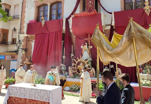 Lucía con esplendor el altar instalado ante el Casino, el cual se había confeccionado con la colaboración de los diferentes estamentos del mundo cofrade de la ciudad, con el fin de acoger esta primera salida en tan destacada festividad, después de que hubiese estado suspendida a consecuencia de la pandemia. Añadir que el altar tuvo como motivo religioso la representación de las tres virtudes teologales, Fe, Esperanza y Caridad, que se hicieron presentes mediante figuras alegóricas, acompañadas a los lados de la Santísima Trinidad y San José