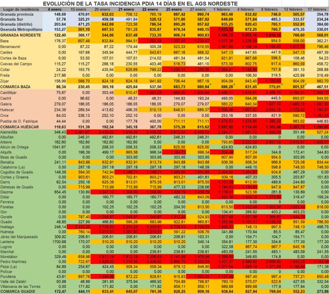 Los Centros que figuran como lugares de extracción de las muestras pueden no coincidir con el domicilio de los pacientes afectados y son los siguientes: En la comarca de Baza: Hospital de Baza 1, Cúllar 1, Baza 1, Zújar 1, Caniles 1 y Freila 1; en la comarca de Guadix: HAR de Guadix 5, Guadix 7 y La Calahorra 1; en la comarca de Huéscar: Huéscar 5 y un caso más en la localidad de Pozo Alcón.