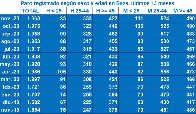 Unos momentos que, en el caso de Baza, mantienen las cifras del paro con unas variaciones mínimas, sobre todo en los últimos meses -1.953 en agosto, 1.958 en septiembre, 1.975 en octubre y, ahora, 1,963 en noviembre-, de forma que los números apenas sufren variaciones en el número de desempleados, en el que hay dos sectores en nuestra ciudad, como el comercio y la hostelería, que han estado sin actividad o en actividad mínima, con todo cuanto eso supone. Recordemos que en el mes de febrero, cuando se inició la pandemia, el número de parados en Baza era de 1.721.