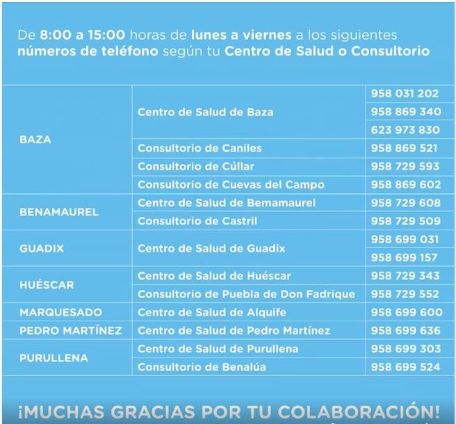 En otro orden de cosas, el AGS de esta zona informa de que se está realizando la toma de muestras en locales de Baza, Guadix y Huéscar; pruebas que van dirigidas al personal contemplado en los protocolos, el cual acude a través de una cita concertada por su MAP y epidemiología.