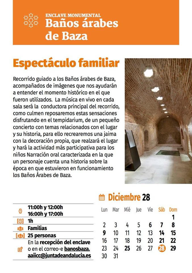 El próximo sábado 28, espectáculo sensorial para toda la familia en los Baños Árabes De Baza. Con cuatro sesiones, a las 11:00h, 12:00h, 16:00h y 17:00h., los Baños Árabes de Baza ofrecen, el sábado 28 de diciembre, un espectáculo sensorial, dirigido a las familias, en el que la propuesta será un recorrido guiado por este monumento bastetano, los Baños Árabes, acompañado de imágenes que hablarán de la Historia de este sitio y de música en vivo, en las diferentes estancias, como pieza conductora de esta visita.