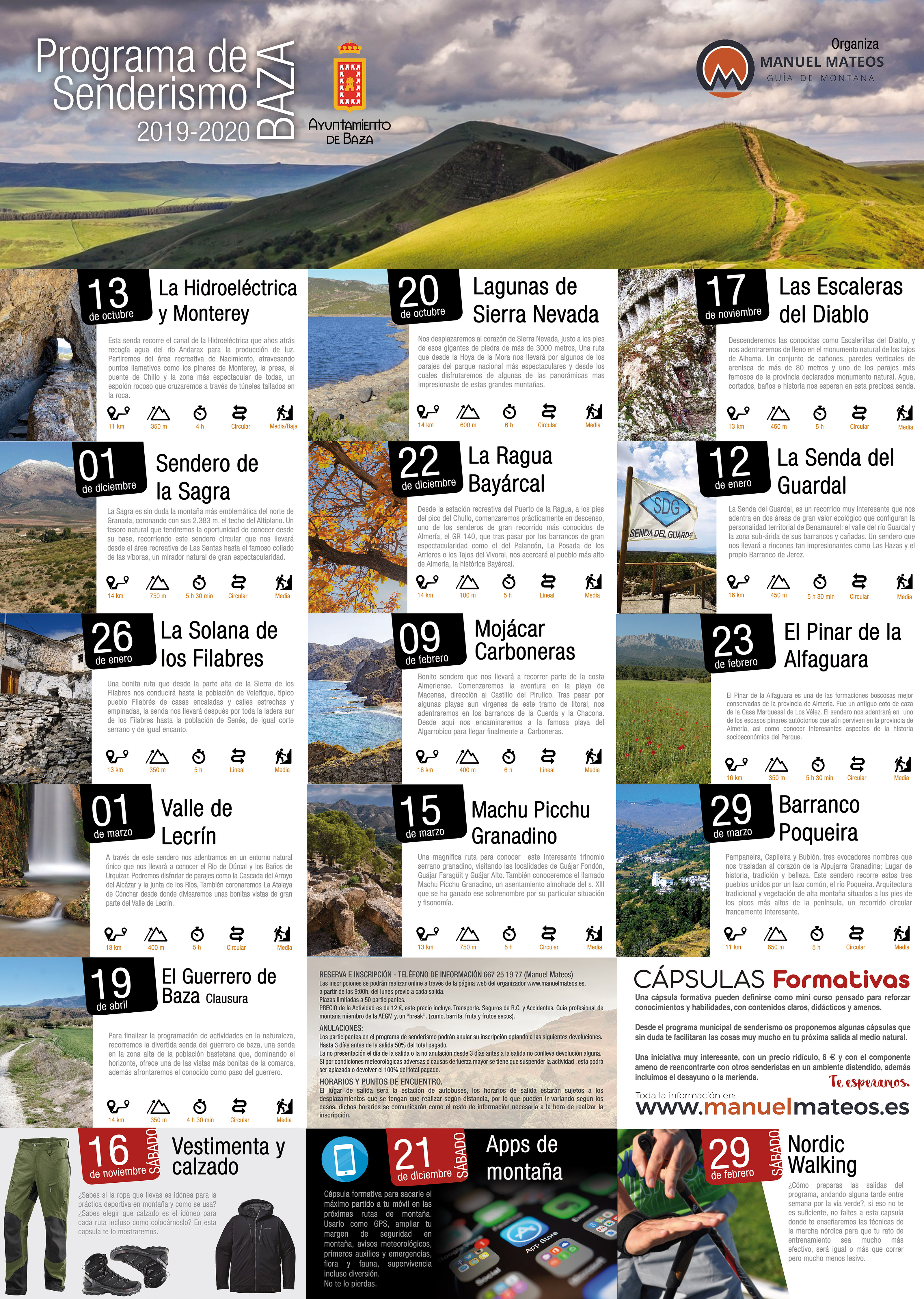 El Programa Municipal de Senderismo discurrirá por 13 rutas que unen naturaleza e historia por entornos de alta montaña, boscosos, con presencia acuática y semi desérticos. El Programa Municipal de Senderismo de Baza ofrece un total de 13 rutas de senderismo por las provincias de Almería y Granada que permitirán disfrutar de entornos naturales diversos y acercarse a la historia de los espacios que se recorrerán desde octubre a abril.