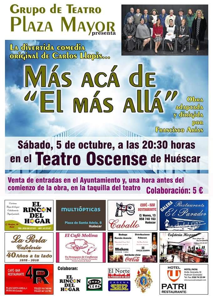 Mañana, 5 de octubre, el Grupo de Teatro Plaza Mayor de Baza actuará en el Teatro Oscense. El próximo sábado 5 de octubre, a partir de las 20.30 horas, el grupo de teatro Plaza Mayor de Baza presentará su obra «Más acá de el más allá» en el Teatro Municipal de Huéscar, cuyo escenario mostrará esta comedia original de Carlos Llopis, con adaptación del director del grupo bastetano, Francisco Arias.