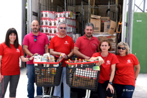 En nombre de Cáritas Baza fue Francisco Castillo, acompañado de un grupo de voluntarios, quienes recibieron esta donación que fue escenificada con unos carritos repletos de alimentos, pero que incluía toda la carga de un camión que, a continuación, hizo entrega real de su contenido en la sede de Cáritas, llenando sus estanterías de alimentos solicitados por ellos y que tenían agotados o comenzaban a escasear.