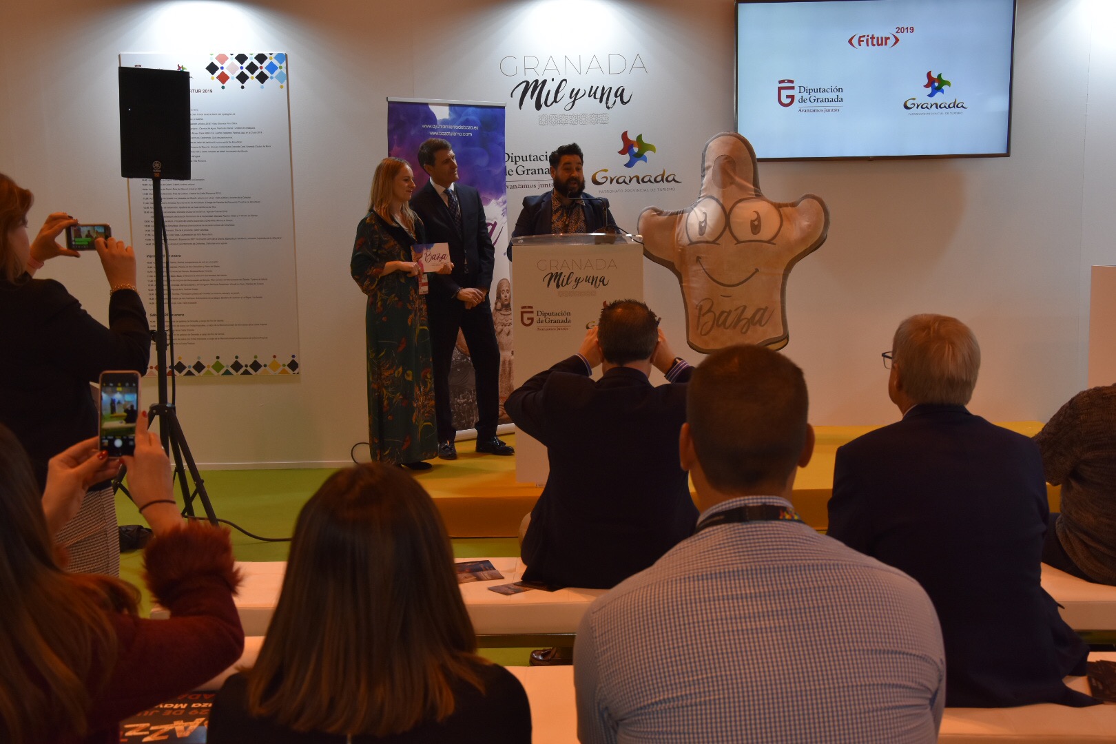 En su presentación el alcalde ha estado acompañado del artista bastetano, David Bastidas, que ha animado a los presentes a visitar la ciudad, para finalizar cantando a capela el himno de la ciudad, Noches de Baza. Además, Vanesa Mesas ha vuelto a ser la imagen en FITUR de nuestra Dama de Baza, con una intensa actividad que le ha supuesto ser citada en algunos medios como “la mejor promotora de la zona -en referencia al Altiplano- […], que ha deambulado de selfie en selfie durante los tres días de feria”.