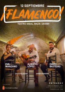 - 20:00 h Espectáculo “Flamenco” con los artistas David Bastidas (cante), Alberto López (guitarra) y Eva Manzano (baile), acompañados por Diego Villegas en los vientos y Roberto Jaén en la percusión. Teatro Ideal de Baza. Entradas anticipadas 10€ en Casa de la Cultura y 15€ en la taquilla.
