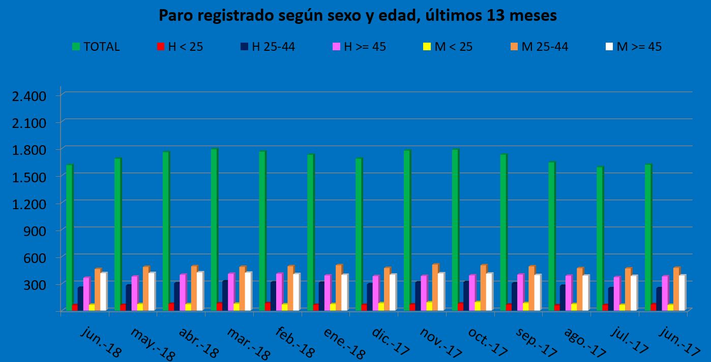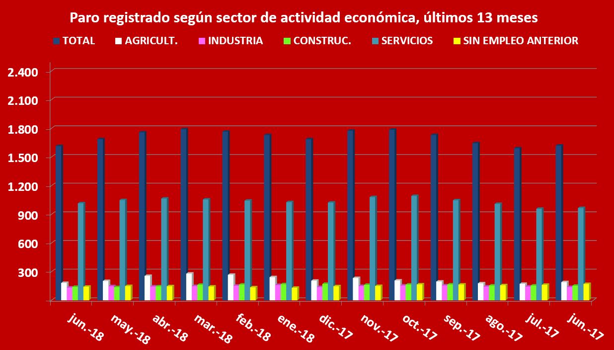Las cifras del mes de junio de este año suponen una disminución de 72 parados respecto al mes anterior, los cuales se reparten en todos los sectores menos en el de la construcción que, sin embargo, registraba tres parados más y con el sector de servicios como el que mejor comportamiento ha tenido. Por sectores de edad, el de entre 25 y 44 años ha sido el que ha dado mejores resultados, mientras que los datos peores corresponden a los hombres menores de 25 años y a las mujeres mayores de 45años