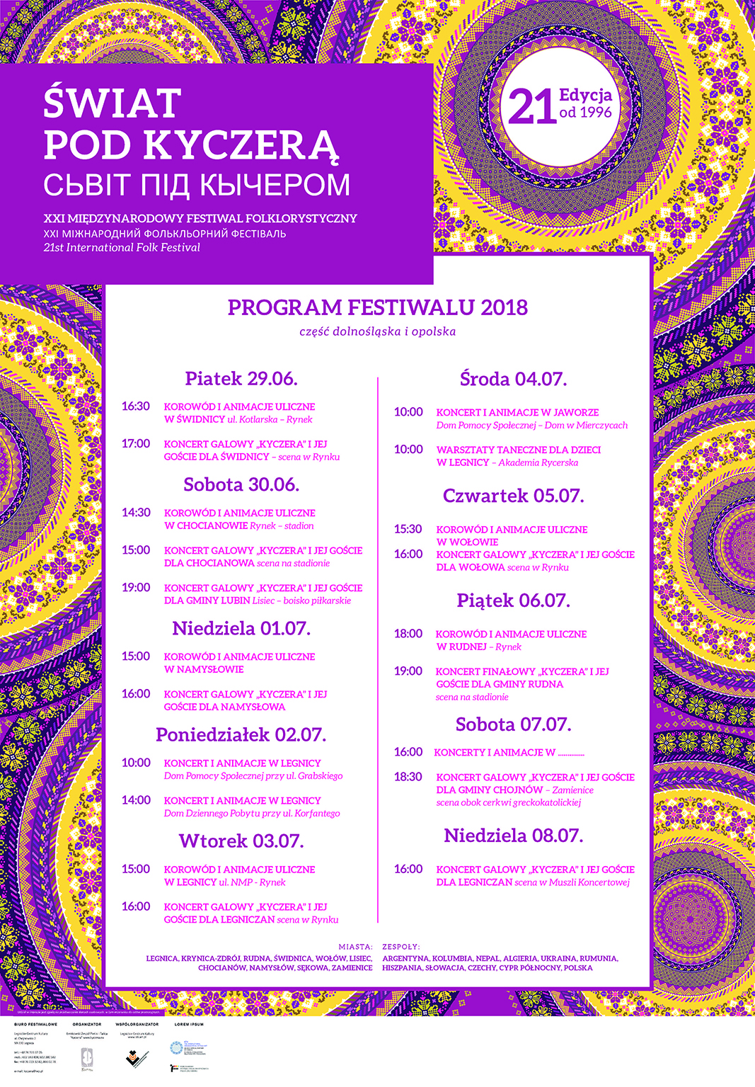 El Festival tiene dos partes principales que se desarrollan en la Polonia Menor y Baja Silesia. Para el primer centro de festivales principal es Krynica – Zdrój y el lugar de presentación es el escenario en el Krynica Promenade. Los participantes del festival también visitan pueblos en los Low y Sądecki Beskids, habitados por Lemkos y Poles.