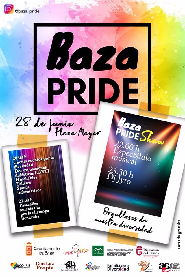 El grupo encargado de diseñar y organizar el festival Baza Pride ha programado para el jueves día 28 una fiesta por la visibilidad de los colectivos LGTBI, “que nos integre a todos, nos dé la oportunidad de que nos vean y nos sientan como iguales, para acabar con el acoso y la incomprensión que muchas veces sufrimos y sufren quienes quieren a personas de su mismo sexo o se sienten diferentes por no ser heterosexuales” apuntan los chicos y chicas.