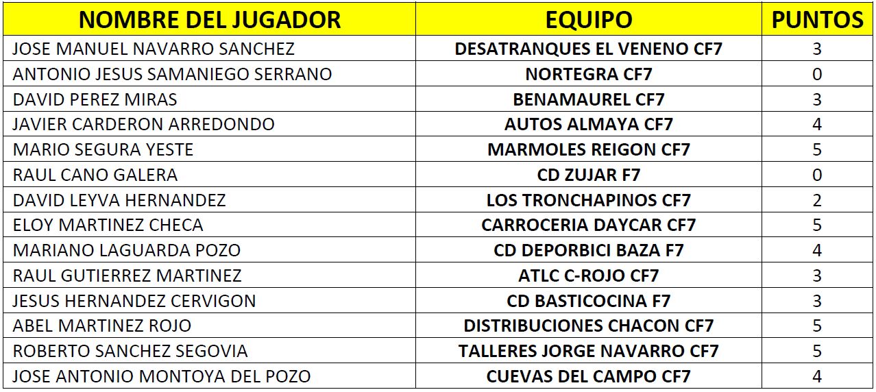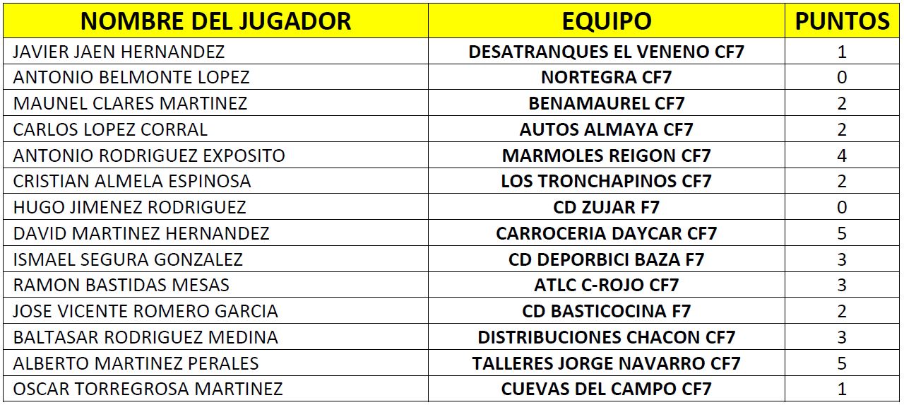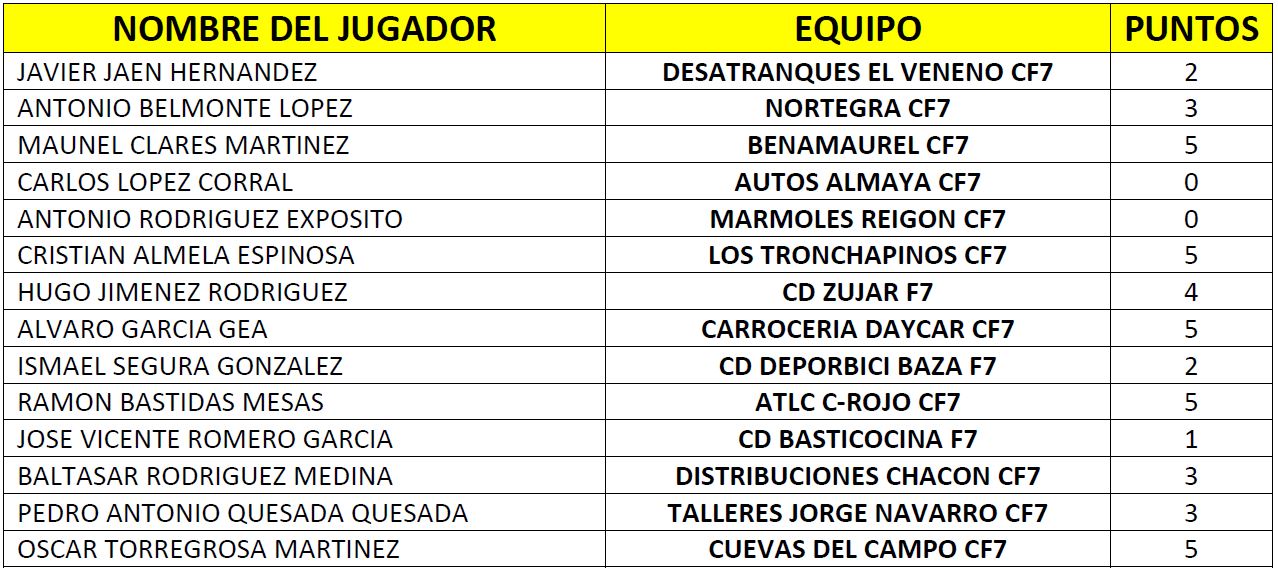 - Tercera amonestación y multa de 3€ a Ángel Brocal Martínez (Talleres Jorge Navarro CF7)