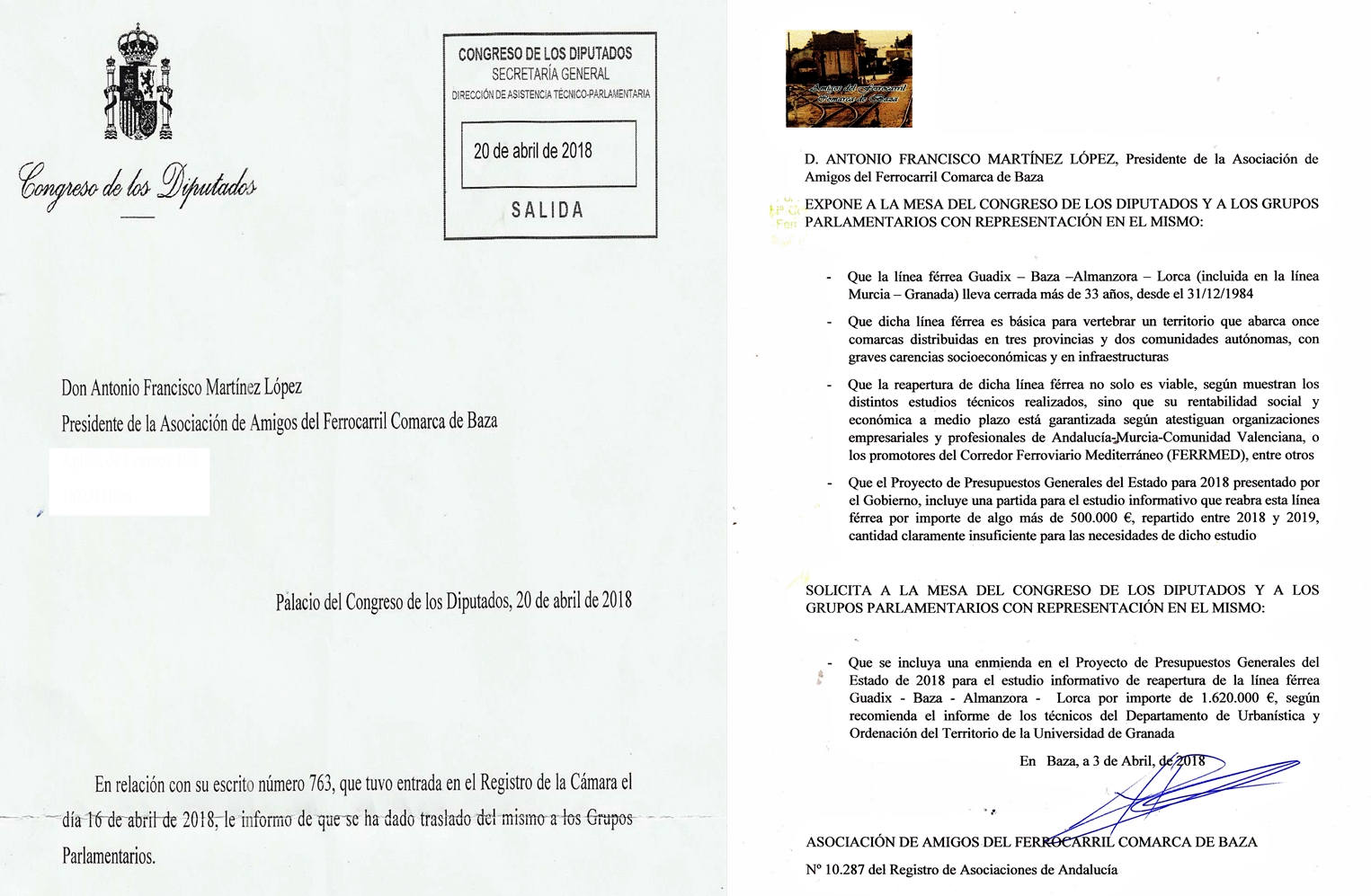 Amigos del Ferrocarril Comarca de Baza pide cuanto más apoyos mejor, porque la vuelta del tren será logro de todos/as o no será; también pide al Gobierno y a todos los Grupos Parlamentarios que sean sensibles a esta justa y justificada petición, aumentando hasta 1.600.000 € la partida destinada al Estudio Informativo que permita la vuelta del tren con plenas garantías a una zona a la que le hace mucha falta.
