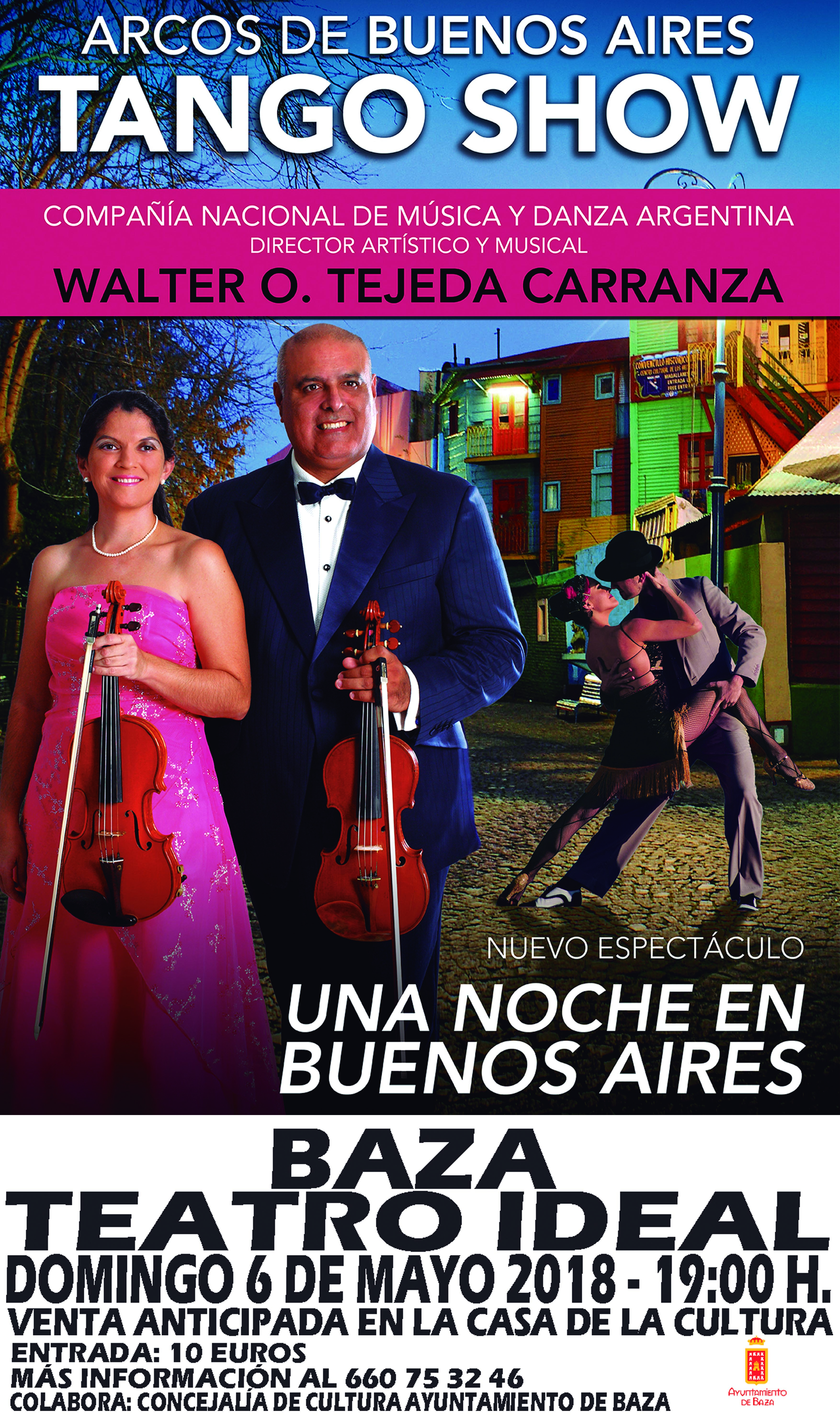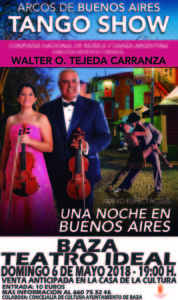 La Compañía Arcos de Buenos Aires ofrecerá su espectáculo Arcos de Buenos Aires Tango Show el domingo 6 de mayo en el Teatro Ideal. Bajo la dirección artística y musical de Walter O. Tejeda Carranza, la Compañía “Arcos de Buenos Aires Tango Show” ofrecerá su nuevo espectáculo “Una Noche en Buenos Aires”, dedicado al tango argentino, con música y danza en vivo, entradas en venta anticipada: en la Casa de la Cultura, al precio de 10 euros y contando con la colaboración de la Concejalía de Cultura del Ayuntamiento bastetano.