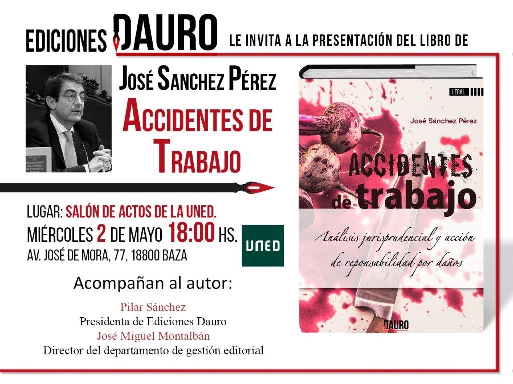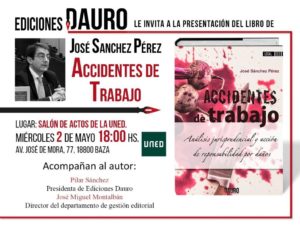 El Centro Asociado a la UNED en Baza acoge la presentación de un libro sobre accidentes de trabajo. Como colofón a las actividades programadas con motivo del Día del Libro, el Centro Asociado a la UNED en Baza realizará esta tarde la presentación del libro “Accidentes de Trabajo. Análisis jurisprudencial y acción de responsabilidad por daños”, del que es autor José Sánchez Pérez, en un acto que tendrá lugar hoy miércoles, día 2 de mayo, a las 18.00 horas, en el Salón de Actos del Centro Asociado a la UNED, en el número 77 de la avenida José de Mora de nuestra ciudad.