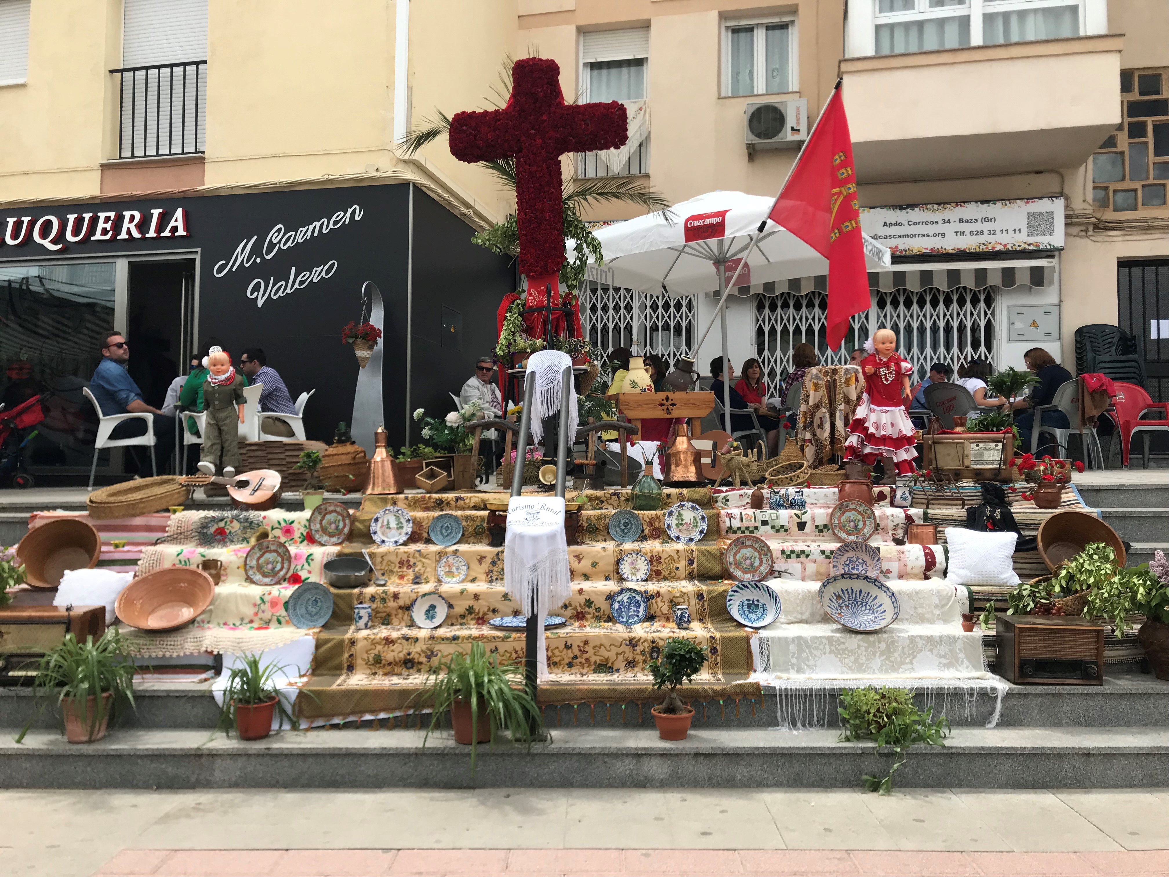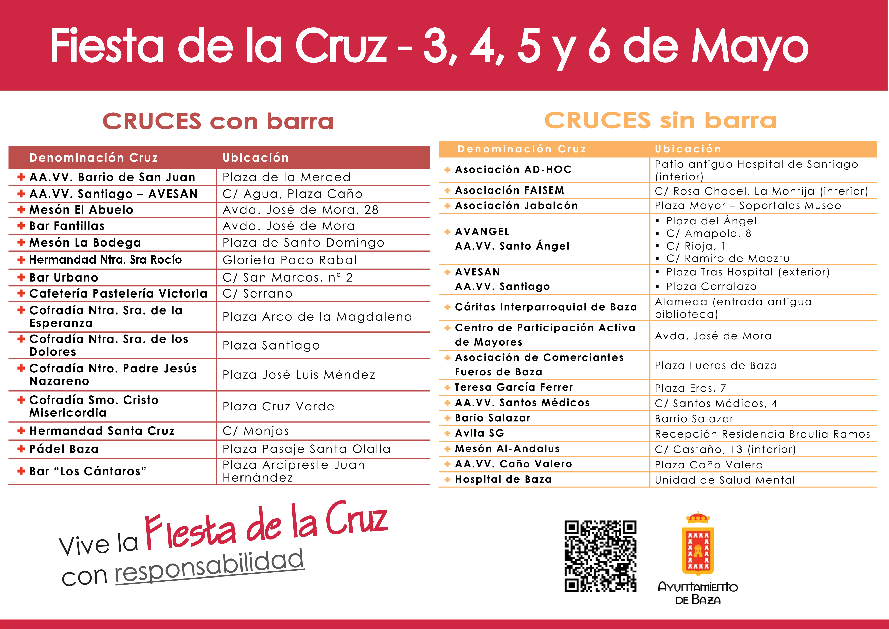 Mapa de las cruces 2018 en Baza. La Cruz en rojo representa las Cruces con Barra y el símbolo amarillo a aquellas sin barra.