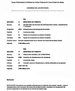 – enmiendas a los PGE2018 presentadas a tal fin en el Congreso de los Diputados por parte del Grupo Parlamentario de Unidos-Podemos, del Grupo Parlamentario Socialista, o la enmienda presentada a la Mesa del Congreso por la propia asociación ferroviaria