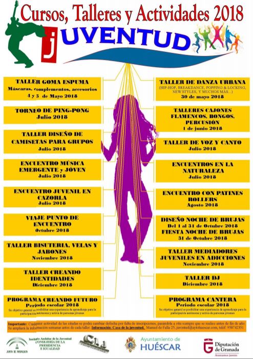 Las propuestas de la juventud oscense protagonizan las actividades para ellos en el 2018. El Ayuntamiento de Huéscar ha hecho pública la oferta de actividades, talleres y encuentros destinados a jóvenes para este año. Tras la recogida de proyectos, ideas y propuestas, durante el mes de marzo en la Casa de la Juventud, se ha confeccionado una amplia oferta de actividades dirigidas a la juventud oscense, con el objetivo de dar respuesta a sus demandas e inquietudes.